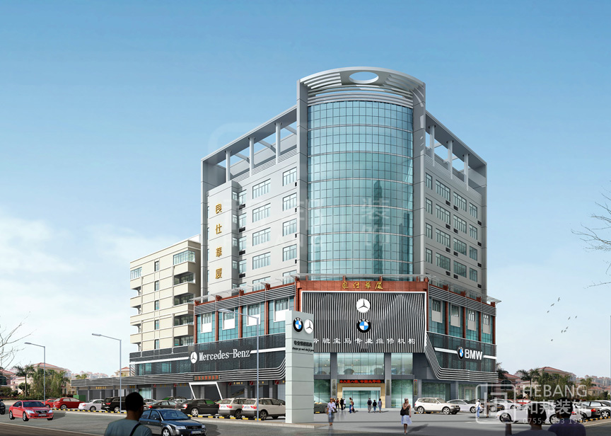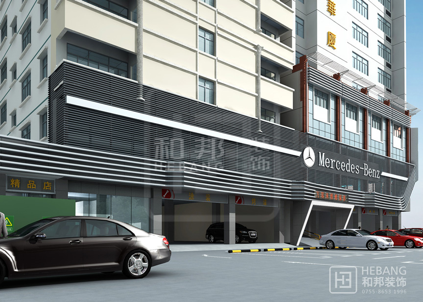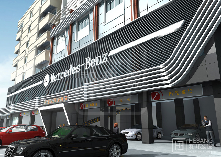 設(shè)計說明 | 高端大氣的現(xiàn)代設(shè)計:以汽車頭部為原型設(shè)計的門頭,大膽新穎,創(chuàng)新十足。分區(qū)設(shè)計,奔馳與寶馬維修店分布兩旁,使整個維修機(jī)構(gòu)美觀大方。 |
