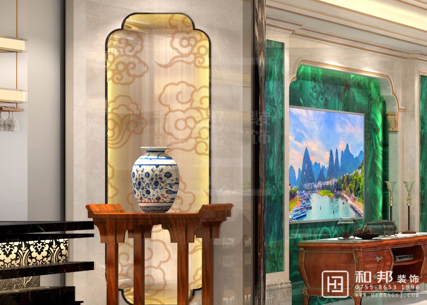 本案從孔雀綠玉石背景墻上彰顯出特意的設(shè)計質(zhì)感,也造就出深淺對比,層次有序的精致風(fēng)華。